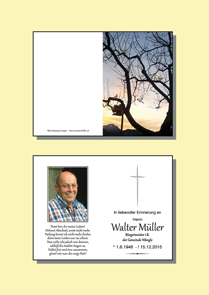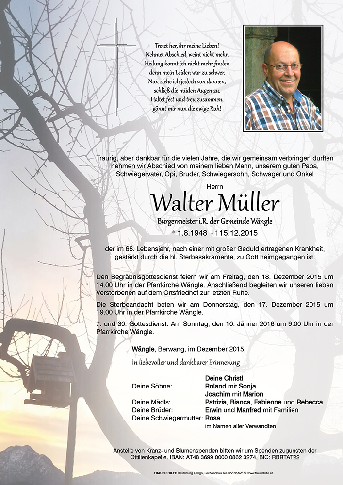 Tief betroffen über den Heimgang von Walter, möchte ich meine aufrichtige Anteilnahme aussprechen16.12.2015 19:46 - Agathe Patricia u. Björn Pellegrini