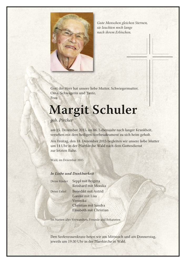 zum Heimgang eurer lieben Mutter entbieten wir unsere Anteilnahme. Sie war immer sehr geschätzt und willkommen.18.12.2015 18:45 - Die Gäste und das Team der Tagesbetreuung SGS Pitztal