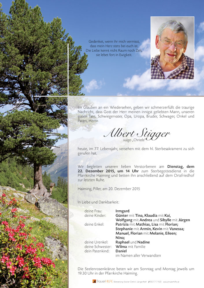 Liebe Irmgard, geschätzte Trauerfamilie. Wir sind während der Zeit des Abschiednehmens in Gedanken bei Euch. Albert wird uns als origineller Haiminger vom alten Schlag in Erinnerung bleiben.